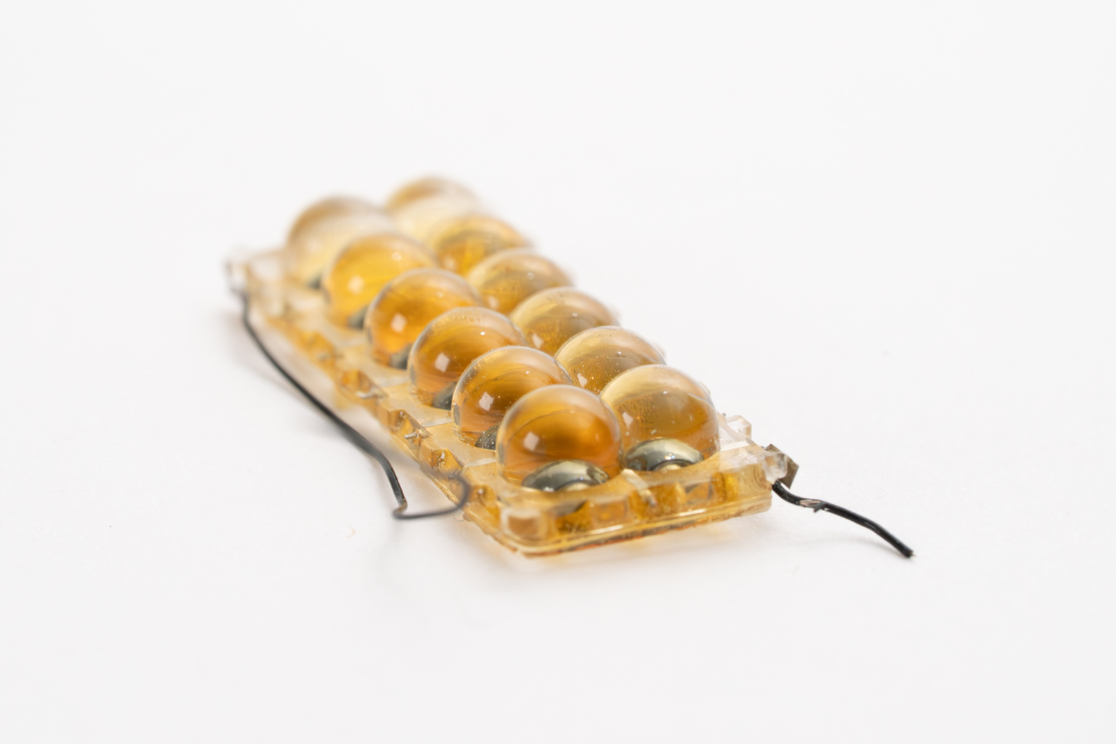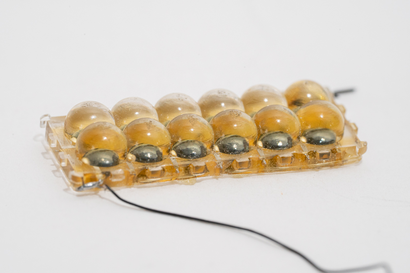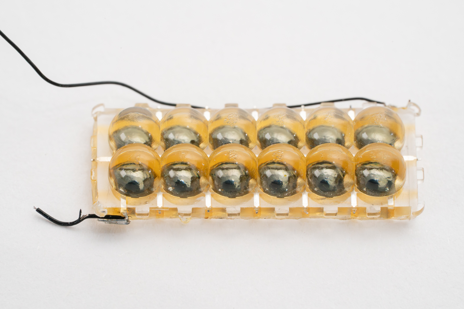 The Sphelar EIPV Series F12 Array is a micro solar generator that uses spheres of mono-crystalline silicon with a PN junction to generate power. This design allows for 360-degree power generation and features a polycarbonate encasement that adds additional solar concentration. The modules can be wired in series and parallel for different voltage and current outputs. These outputs range from 0.48 – 6 Vmp and 28 – 2.2 mA Imp respectively.